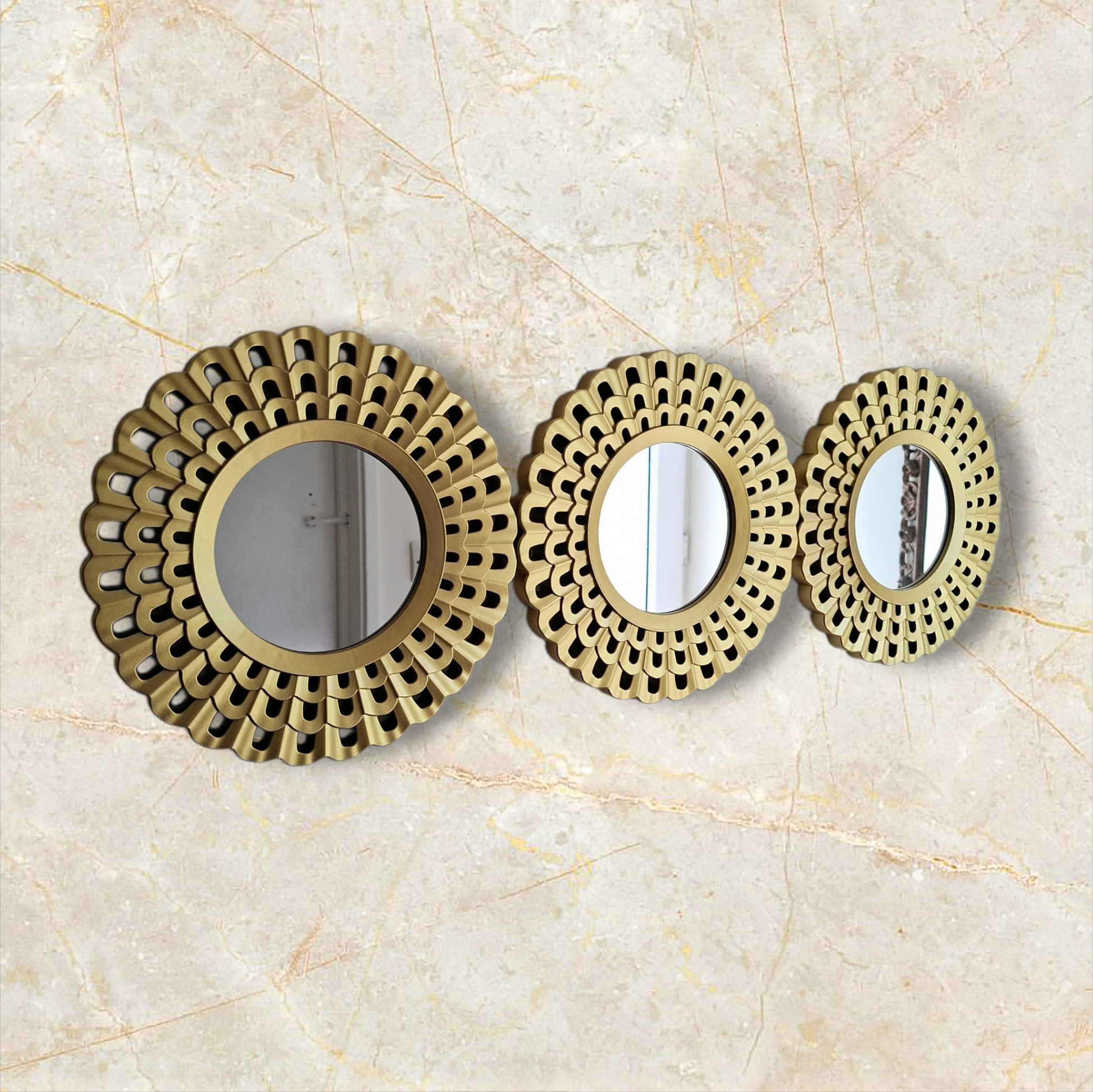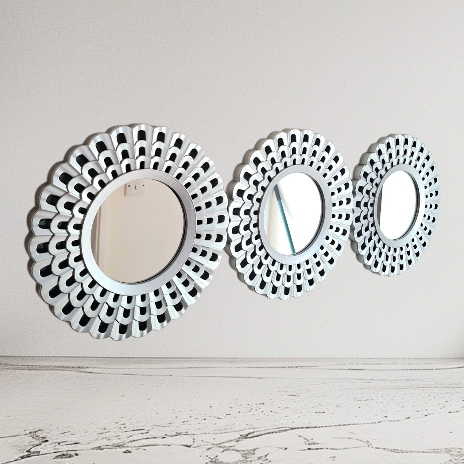 Set of 3 SMALL BEAUTUFUL sunburst starburst floral mirrors. Add a touch of elegance and uniqueness to any room with this stunning wall hanging decorative mirrors art plates.