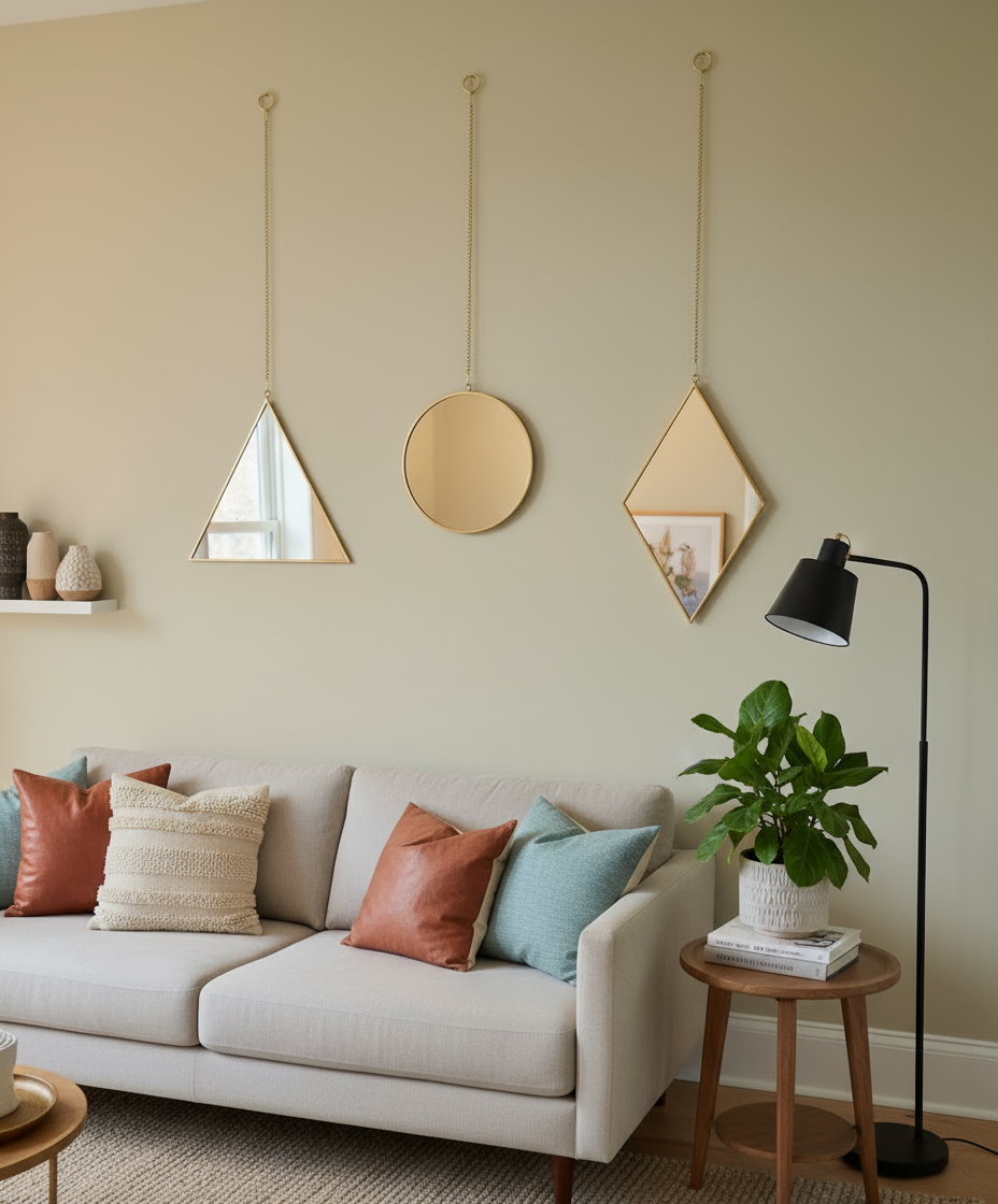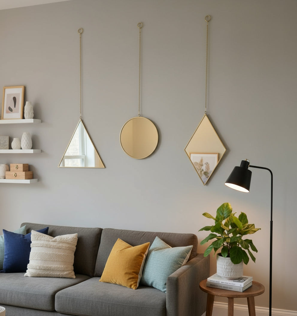 The mirrors unique style of circle, diamond and triangle make them perfect for any room in the house including the bedroom, living room, lounge, hallway or even the bathroom. They hang elegantly off chains that are removable.